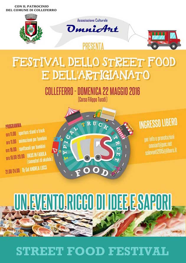 COLLEFERRO (RM) – Il Festival dello Street Food e dell’Artigianato è un’iniziativa, organizzata dall’Associazione Culturale Omniart, con il Patrocinio del Comune di Colleferro, che si terrà Domenica 22 Maggio dalle ore 10 a mezzanotte lungo Corso Filippo Turati, che per l’occasione verrà chiuso al traffico locale permettendo che l’intero corso diventi isola pedonale.