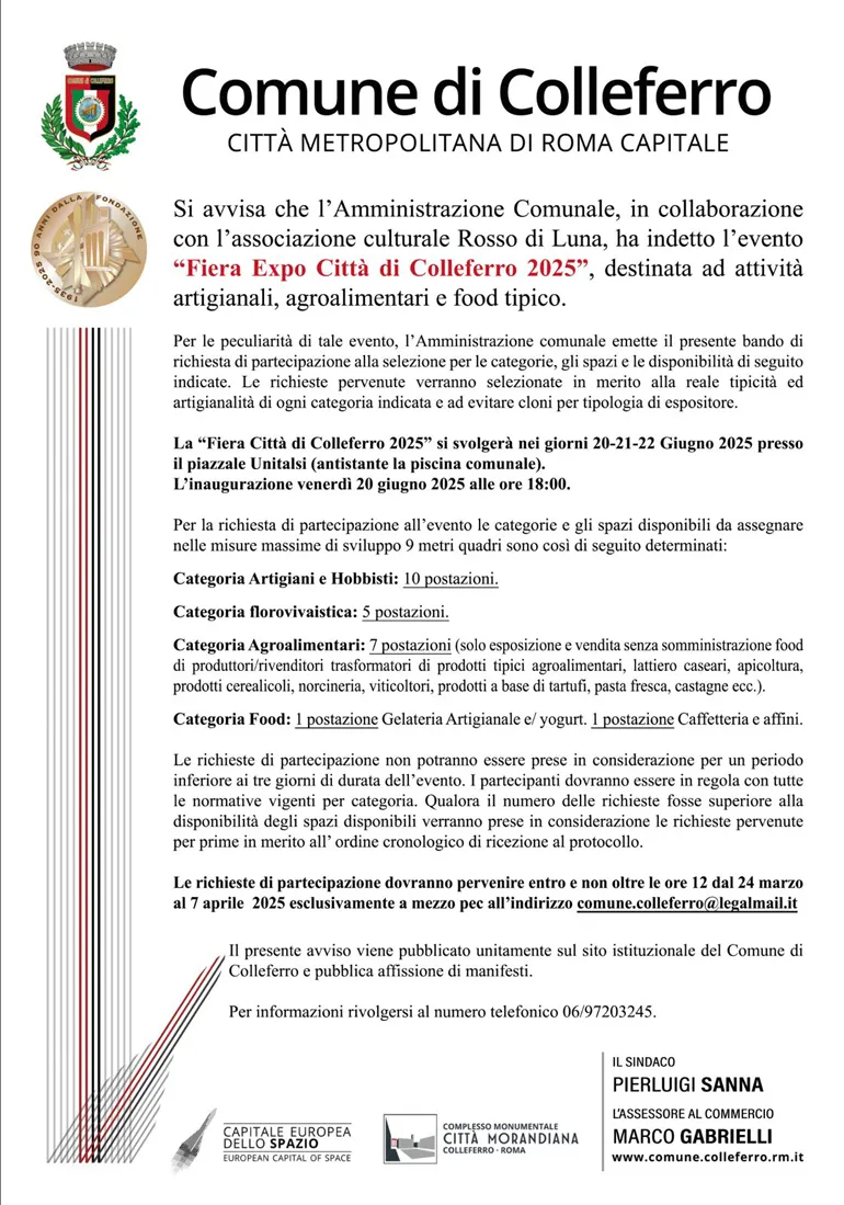 COLLEFERRO – In questi giorni l’Amministrazione comunale di Colleferro è impegnata – in collaborazione con l’Associazione “Rosso di Luna”, nell’organizzazione dell’evento “Fiera Expo Città di Colleferro 2025” che si svolgerà nei giorni 20-21-22 Giugno 2025 in Piazzale Unitalsi (area antistante la piscina comunale). Inaugurazione prevista per Venerdì 20 Giugno 2025 alle ore 18.