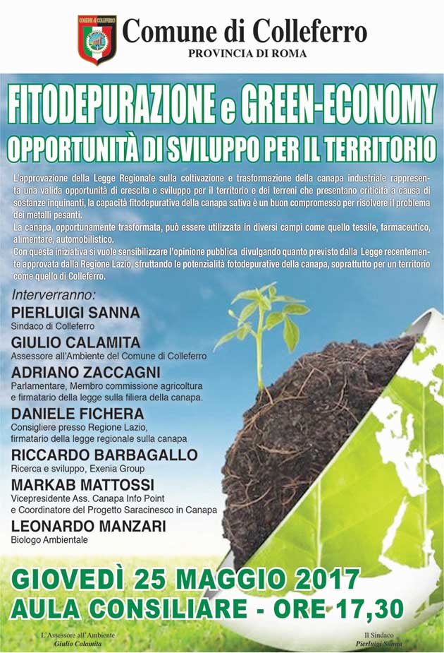 Con questa iniziativa si vuole sensibilizzare l’opinione pubblica divulgando quanto previsto dalla legge recentemente approvata dalla Regione Lazio, sfruttando le potenzialità fotodepurative della canapa, soprattutto per un territorio come quello di Colleferro.