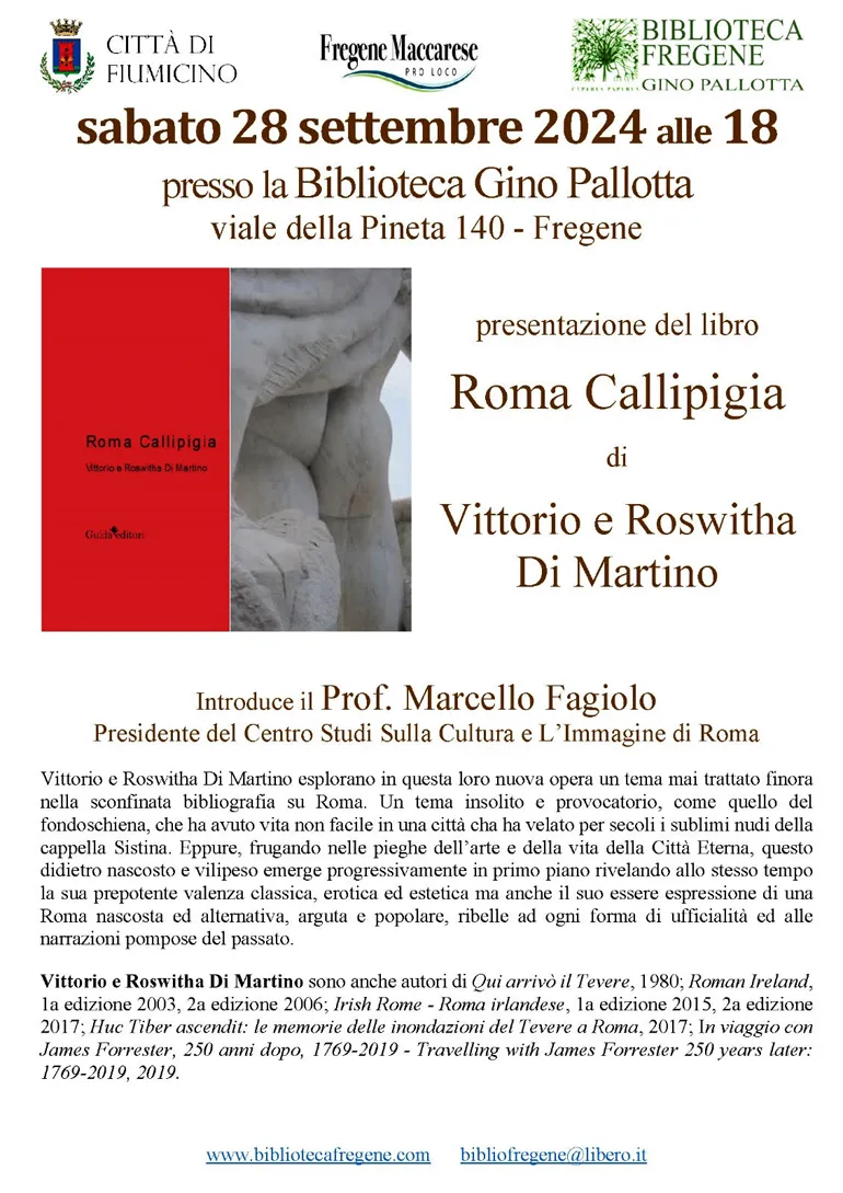 FIUMICINO (Luciana Vinci) – Sabato 28 Settembre alle ore 18, presso la Biblioteca Gino Pallotta di Fregene verrà presentato il libro ROMA CALLIPIGIA di Vittorio e Roswitha Di Martino.