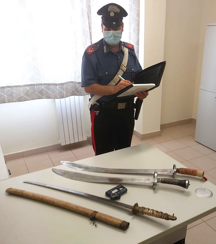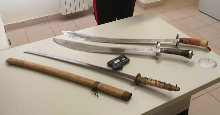 La successiva perquisizione domiciliare eseguita a casa dell’arrestato ha consentito, infine, di sequestrare una “katana” giapponese, altre due sciabole e un coltello a serramanico.