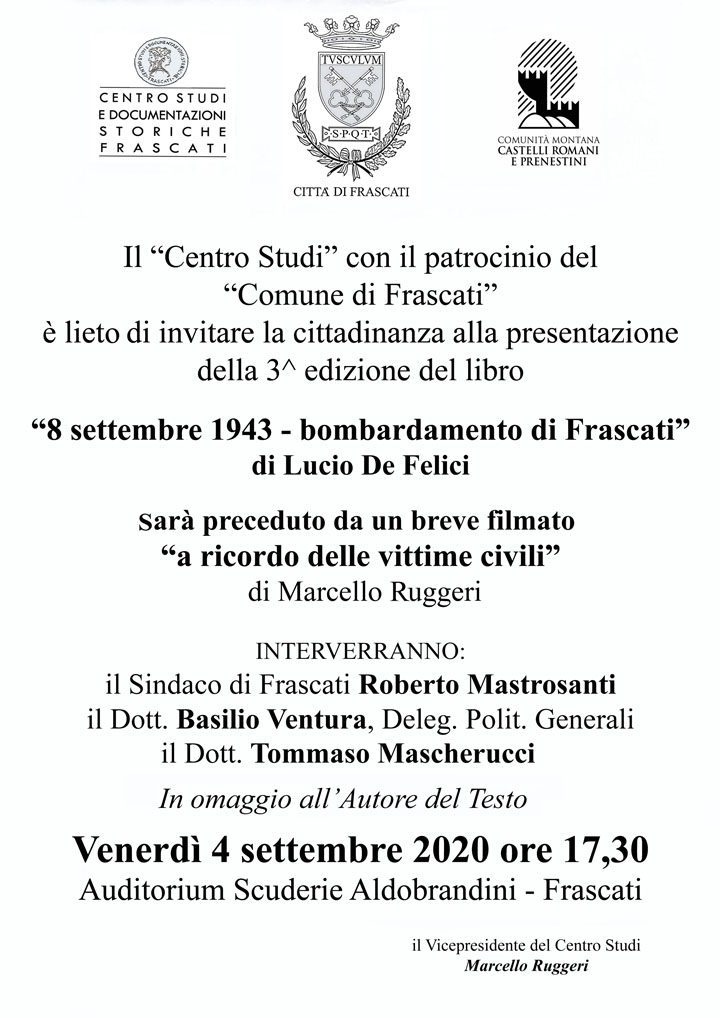 FRASCATI (Luciana Vinci)– Alla presentazione della 3^ edizione del volume “8 Settembre 1943 – Bombardamento di Frascati” non ci sarà l’autore: Lucio De Felici.