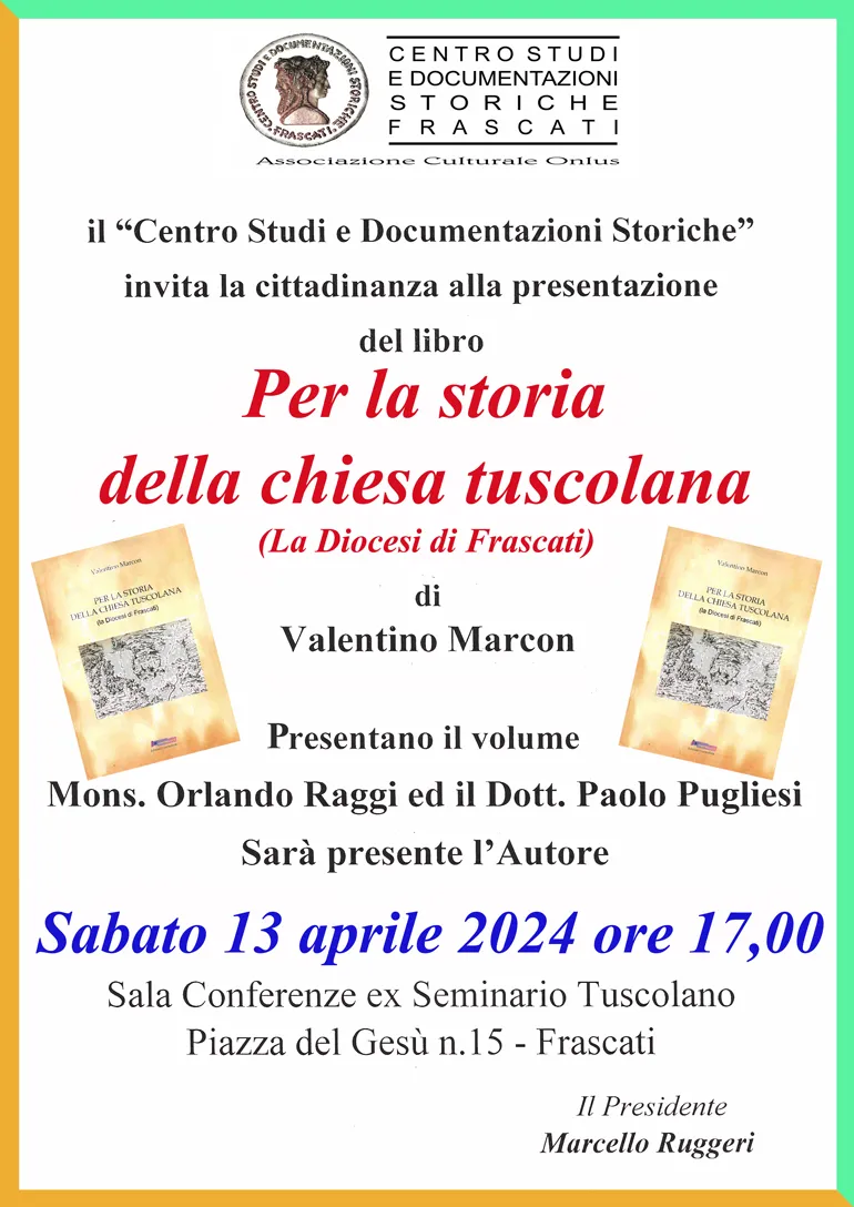 FRASCATI (Luciana Vinci) – Il Centro Studi e Documentazioni Storiche di Frascati Sabato 13 Aprile 2024 presenterà il libro di Valentino Marcon “Per la storia della chiesa tuscolana” (La Diocesi di Frascati)