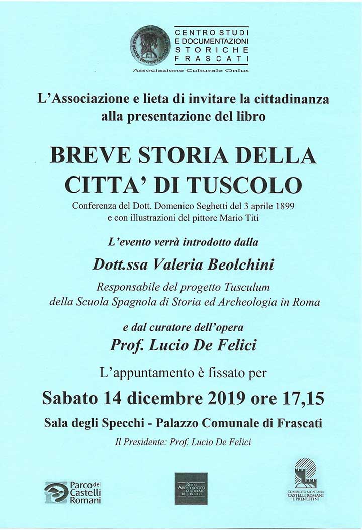FRASCATI (Anna Maria Pesce – Luciana Vinci) – Sabato 14 Dicembre, il Prof. Lucio De Felici presenterà, nella Sala degli Specchi, la “Breve Storia della Città di Tuscolo” dalla conferenza dello storico Domenico Seghetti (3 Aprile 1899).