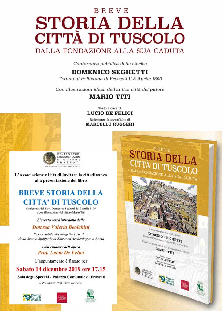 Il grande ed eccezionale ricercatore di Frascati, Prof. Lucio De Felici, Presidente del Centro Studi e Documentazioni Storiche Frascati, dalla Conferenza pubblica dello storico Domenico Seghetti, tenuta al Politeama di Frascati il 3 Aprile 1899, ha curato il testo e l’opera della “Breve Storia della Città di Tuscolo” con illustrazioni ideali del pittore Mario Titi, e referenze fotografiche di Marcello Ruggeri.