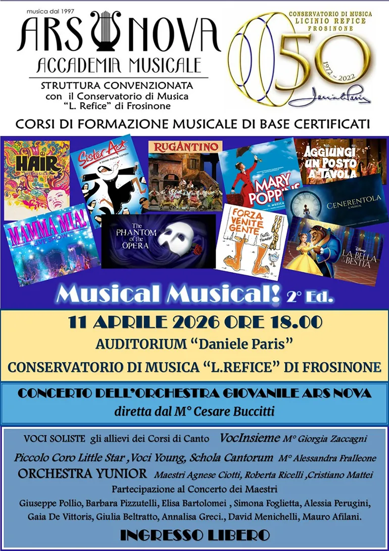 FROSINONE – L’ Accademia di Musica e Spettacolo Ars Nova porterà la 2° Edizione di “Musical musical!” questo sabato 11 Aprile 2026 alle ore 18 sul palco dell’Auditorium del Conservatorio di Musica di Frosinone con il quale è convenzionata per i Corsi di Formazione Musicale di Base Certificati ad Indirizzo sia Classico che Moderno.