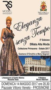 FROSINONE – Torna Domenica 14 Maggio, nell’anfiteatro “naturale” di Piazzale Vittorio Veneto, nel cuore del Centro storico di Frosinone, la sfilata di alta moda “Eleganza Senza Tempo”.