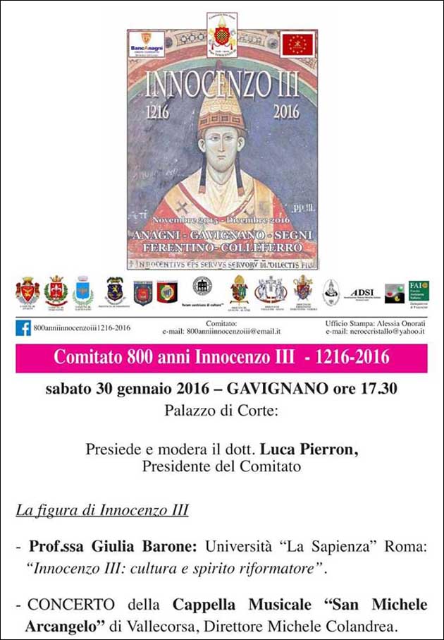 GAVIGNANO (RM) – Si è tenuto a Gavignano nel pomeriggio di Sabato 30 Gennaio, presso la splendida Sala Olimpiadi Palazzo di Corte, il terzo degli eventi in programma per gli “800 anni dalla morte di Innocenzo III – 1216-2016”, al secolo Lotario dei Conti di Segni.