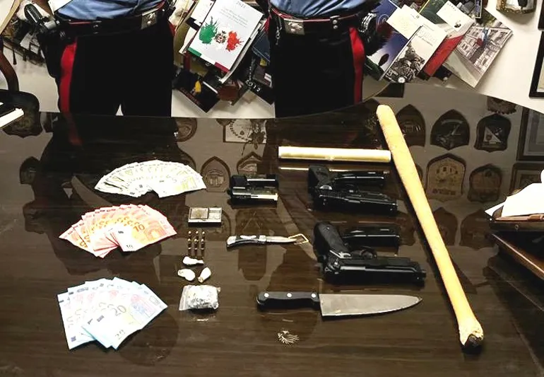 A seguito della perquisizione personale, sono stati trovati in possesso di tre dosi di cocaina nonché di una pistola calibro 8 con sei colpi, una mazza da baseball, due coltelli (uno da cucina ed uno a serramanico) ed una pistola a salve privata del tappo rosso.