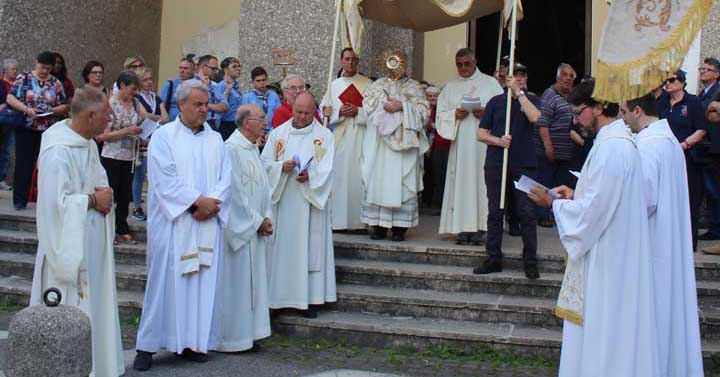COLLEFERRO (Eledina Lorenzon) – Grande e commossa partecipazione di fedeli Domenica 3 Giugno a Colleferro per la Processione del Corpus Domini, affidata quest’anno alla Parrocchia di S. Barbara.