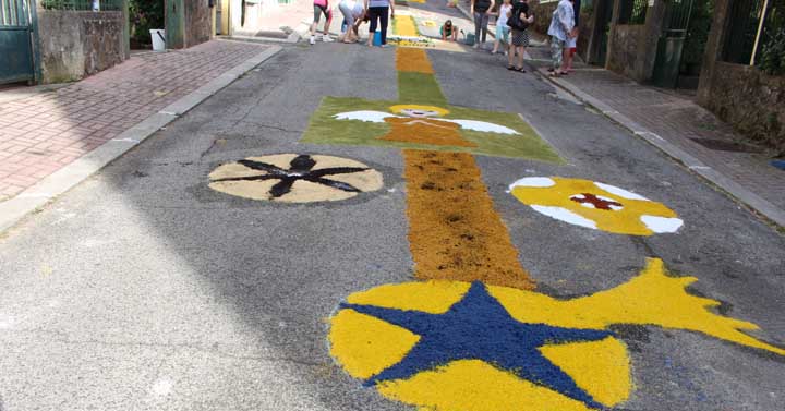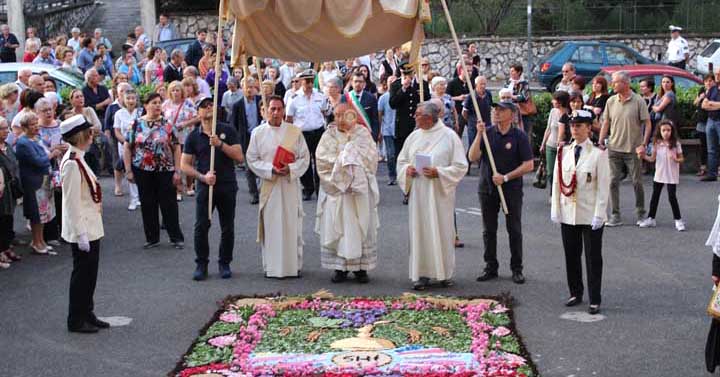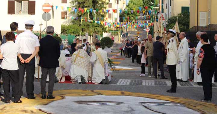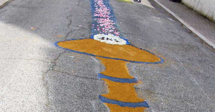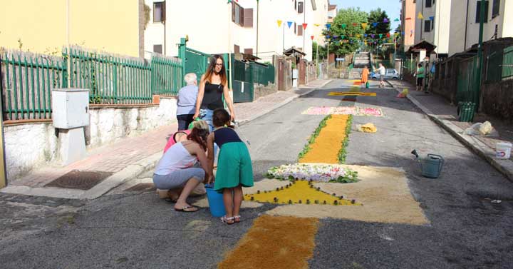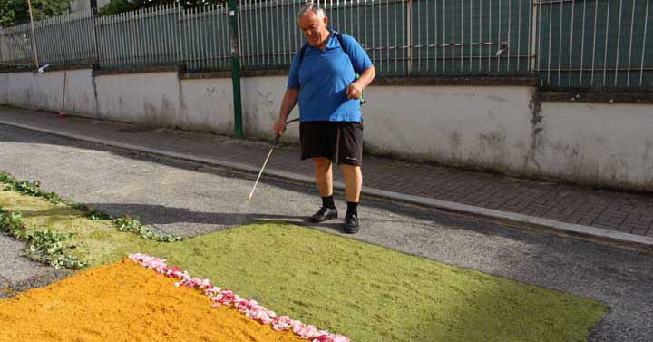Qui il Comitato di Quartiere in collaborazione con quello di S. Anna, grazie all’impegno e la passione di tanti cittadini, nonostante la giornata particolarmente calda, ha contribuito a far rivivere la tradizione dell’infiorata, allestendo un lungo tappeto colorato.