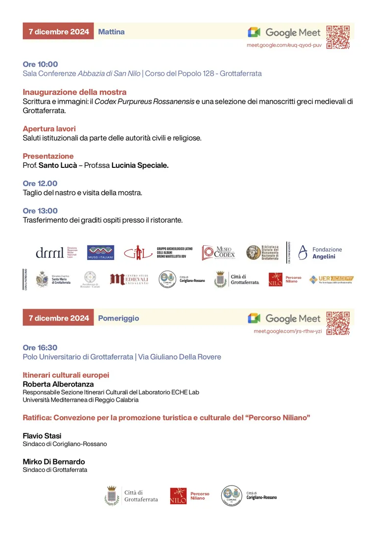 L’inaugurazione si terrà presso la Sala Conferenze dell’Abbazia di San Nilo alle ore 10, con i saluti delle autorità civili e religiose e la partecipazione dei sindaci di Corigliano-Rossano (Cs), Flavio Stasi, e di Grottaferrata (Rm), Mirko Di Bernardo.