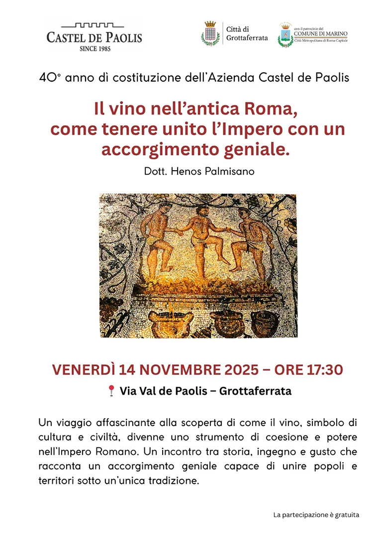 GROTTAFERRATA (Luciana Vinci) – Nell’ambito delle iniziative organizzate per celebrare il quarantennale dell’Azienda Agricola Castel de Paolis, Venerdì 14 Novembre 2025 alle ore 17:30, presso la sede di Via Val de Paolis a Grottaferrata, si terrà la conferenza dal titolo: “Il vino nell’antica Roma, come tenere unito l’impero con un accorgimento geniale”, a cura del dottor Henos Palmisano.