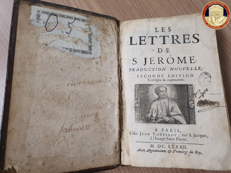 ROMA – Il volume del Seicento in lingua francese dal titolo “Les lettres de S. Jerome”, ristampa del 1682 degli scritti di carattere dottrinale-religioso di San Girolamo, è stato consegnato a Padre Raul Pablo Gonzalez Bernardi, Direttore della Biblioteca “Peter – Hans Kolvenbach” della Curia Generalizia dell’Ordine dei Gesuiti di Roma, dai Carabinieri del Nucleo per la Tutela del Patrimonio Culturale (TPC) di Udine, al comando del Magg. Lorenzo Pella.