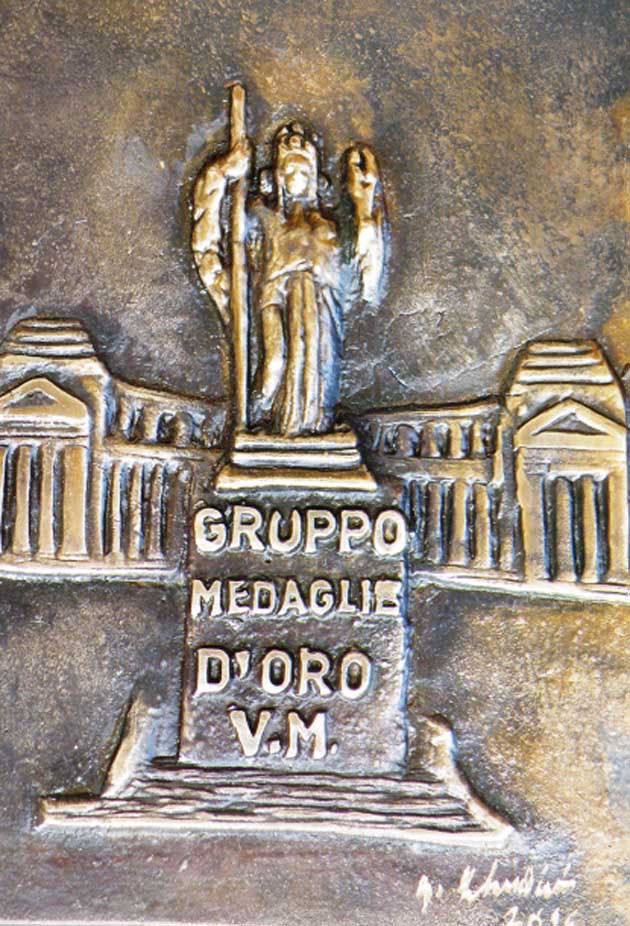 Le Medaglie d’Oro sono la più nobile manifestazione dell’eroismo del soldato italiano. Il sacrificio verso la Patria non ha frontiere ideologiche ma vive nel tempo in maniera sacra per le generazioni future. Il lavoro di Cherubini così dettagliato e simbolico nel fondo possiede la grecità e nella parte centrale vi è la rappresentazione della vittoria che comunque dona imperitura riconoscenza anche ai vinti. La vittoria infatti non è soltanto un appannaggio per chi vince ma anche per chi perde.