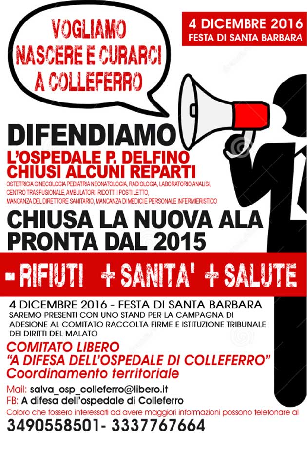 COLLEFERRO (RM) – I volontari del Comitato libero “In difesa dell’Ospedale di Colleferro” – Coordinamento territoriale saranno presenti il giorno della Santa Patrona, Barbara, Domenica 4 Dicembre 2016, in Piazza Italia, Colleferro.