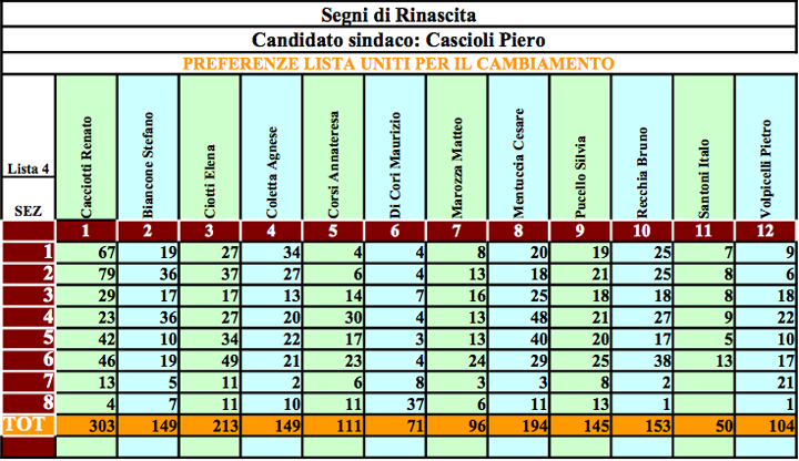 Ebbene l’elettorato di Segni ha eletto il suo nuovo sindaco individuandolo nella persona di Piero Cascioli (Lista Segni di Rinascita), che vince le elezioni con 1.558 voti (31,54% – 8 seggi), a seguire Cesare Rinaldi (Lista Centrosinistra con Rinaldi) con 1.350 voti (27,33% – 2 seggi), Giuseppe Raviglia (Raviglia Sindaco) con 1.022 voti (20,69% – 1 seggio), Guido Bassetto (Lista M5S) con 524 voti (10,60% – 1 seggio), Cristina Vittori (Italia In Comune) con 485 voti (9,81% – 0 seggi).