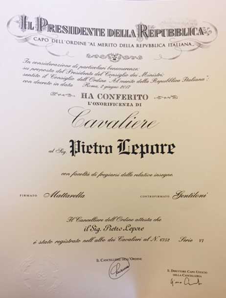 Il Presidente della Repubblica ha conferito a Pietro Lepore la prestigiosa onorificenza di Cavaliere Ordine al Merito della Repubblica Italiana