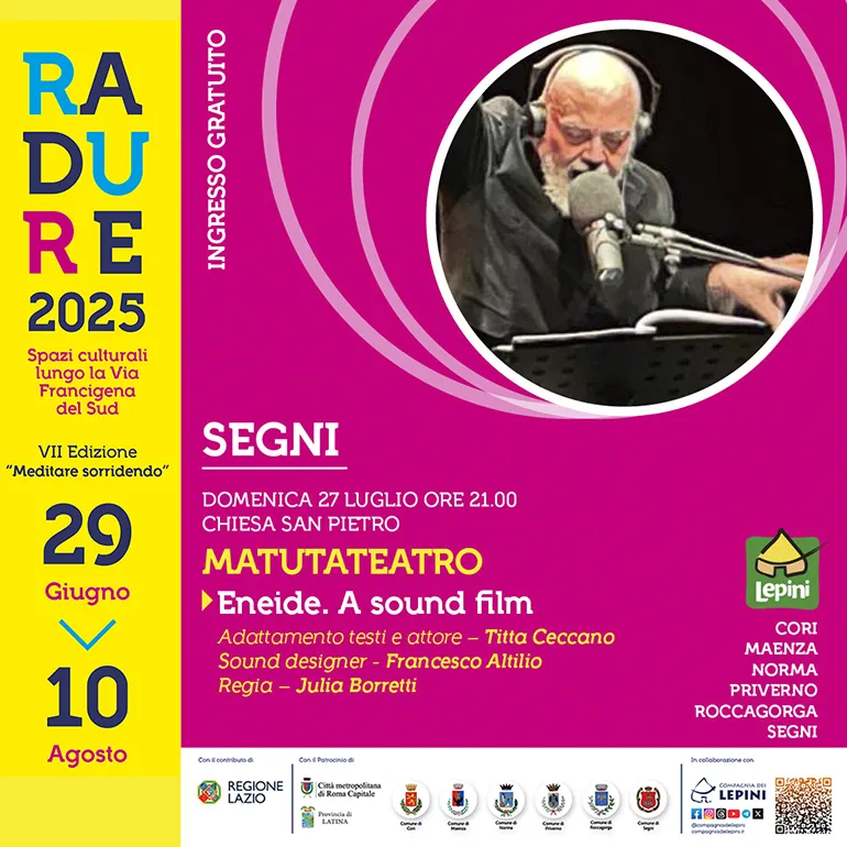 Nell’ambito di questa fortunata iniziativa, Domenica 27 Luglio alle ore 21 nella Chiesa di S. Pietro a Segni andrà in scena “Eneide. A sound film”, la nuova produzione di Matutateatro, uno spettacolo di teatro e musica elettronica, ispirato all’Eneide virgiliana, in particolare al Libro XI. (ingresso gratuito – click sulla seguente locandina per approfondire).