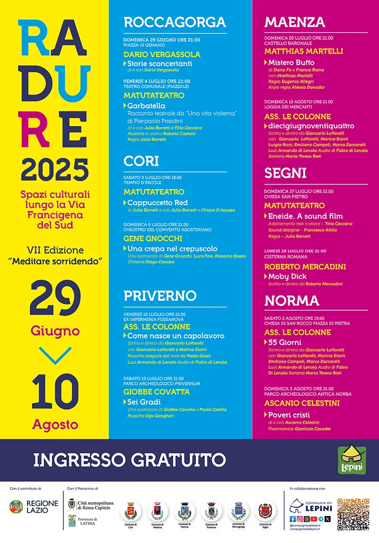 È IN CORSO ormai da quasi un mese la VII Edizione di “Radure – Spazi culturali lungo la Via Francigena del Sud 2025” una proposta culturale d’eccellenza della Compagnia dei Lepini – con i Patrocini di Città Metropolitana di Roma Capitale e della Provincia di Latina – che ha lo scopo di promuovere il territorio e rilanciarne l’immagine, attraverso la commistione tra le arti dello spettacolo dal vivo, le identità dei luoghi e la partecipazione attiva delle realtà operanti in questi splendidi Comuni.