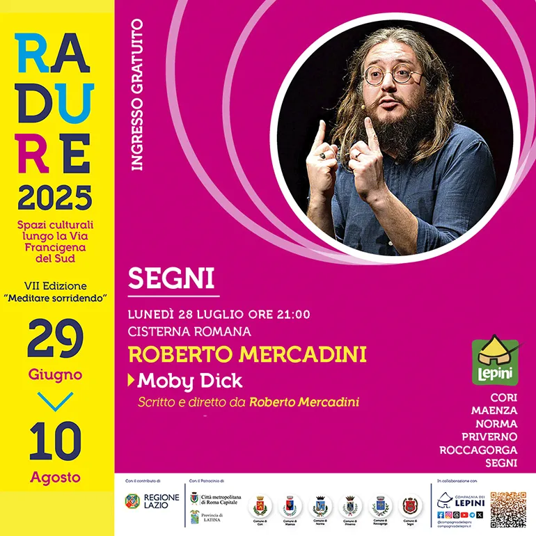 Di grande interesse sarà anche Lunedì 28 Luglio, sempre alle ore 21, nella Cisterna romana di Segni, “Moby Dick” l’acclamato monologo di e con Roberto Mercadini (ingresso gratuito – click sulla seguente locandina per approfondire).