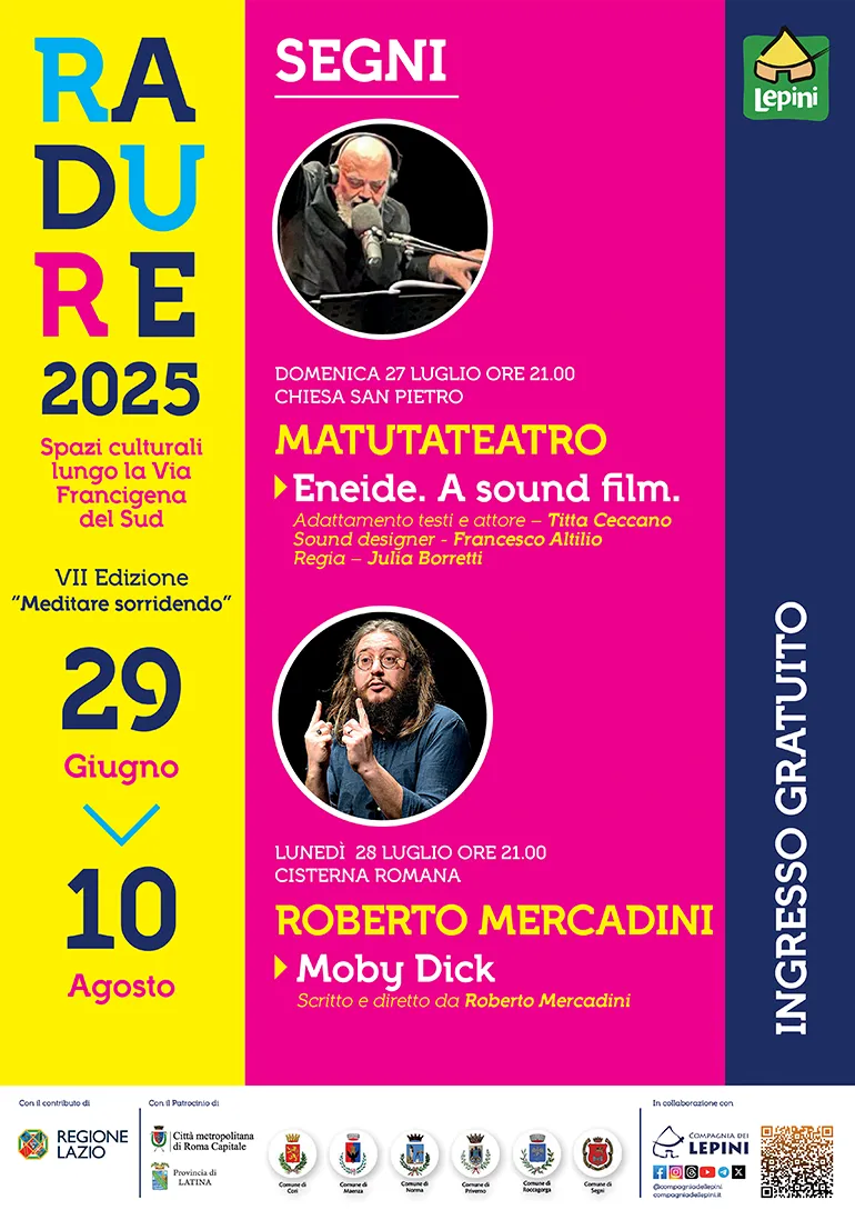 Sostenuto dalla Regione Lazio e curato dalla Compagnia dei Lepini, Radure 2025 ha scelto come filo conduttore il tema “Meditare Sorridendo”: una riflessione ironica e profonda sulle urgenze del nostro tempo, affrontate con intelligenza e leggerezza.