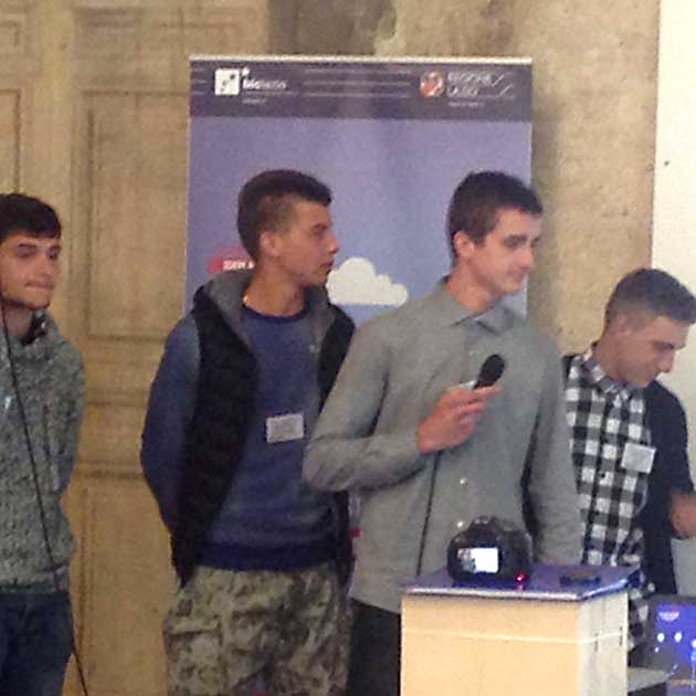 Il team del “Boole” – formato dagli studenti Luca Pavone, Alexandru Parfene, Alin Virlan e Richard Spadoni, accompagnati dal prof. Davide Brocchetti – ha vinto, per la categoria “SocialCar Award”, istituito quest’anno, con un’idea tecnologicamente innovativa per la segnalazione notturna del senso di marcia delle rotatorie, consistente in una serie di led blu, che si attivano automaticamente al sopraggiungere di una vettura, lampeggiando uno dopo l’altro nel verso di rotazione.
