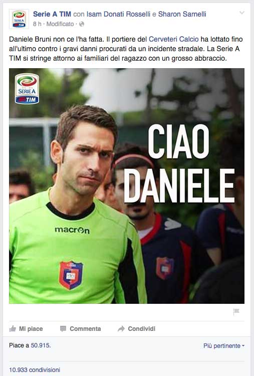 La Serie A Tim sulla sua pagina facebook gli ha dedicato un post fotografico.