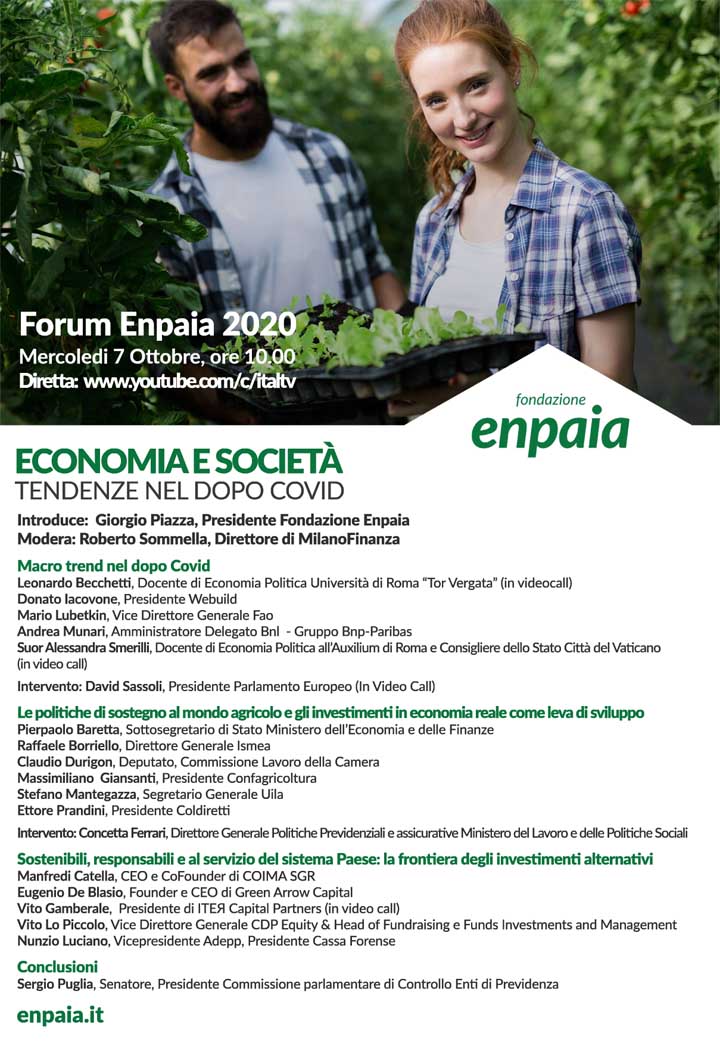 Tra i partecipanti alla prima sessione, “Macro trend nel dopo Covid”: Giorgio Piazza, Presidente Fondazione Enpaia; David Sassoli, Presidente Parlamento Europeo; Leonardo Becchetti, Docente di Economia Politica Università di Roma “Tor Vergata”; Donato Iacovone, Presidente Webuild; Mario Lubetkin, Vice Direttore Generale Fao; Andrea Munari, Amministratore Delegato Bnl – Gruppo Bnp-Paribas; Suor Alessandra Smerilli, Docente di Economia Politica all’Auxilium di Roma e Consigliere dello Stato Città del Vaticano.