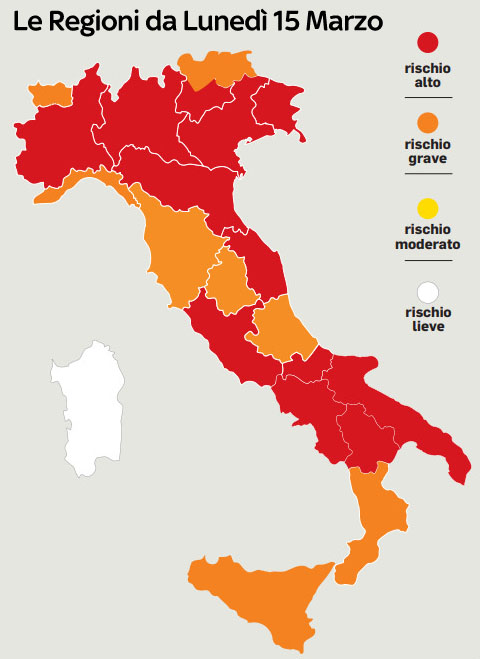 Da Lunedì 15 Marzo l’Italia non avrà regioni in “Zona Gialla”. La Sardegna resterà “Zona Bianca”.