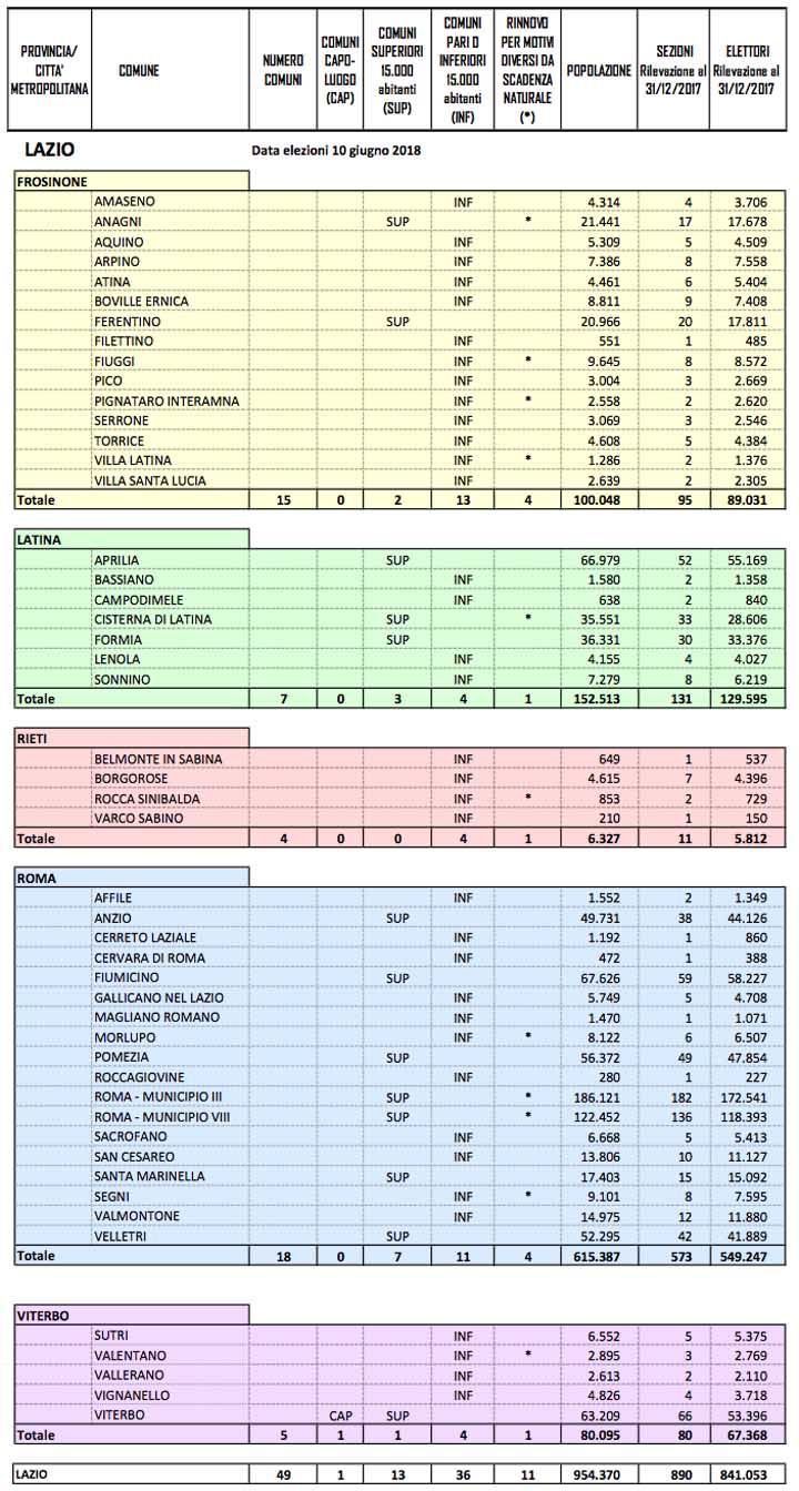 I Comuni del Lazio con popolazione superiore a 15mila abitanti – e che quindi torneranno alle urne per l’eventuale ballottaggio il 24 Giugno – sono 13 [Anagni (Fr), Anzio (Rm), Aprilia (Lt), Cisterna di Latina (Lt), Ferentino (Fr), Fiumicino (Rm), Formia (Lt), Pomezia (Rm), Santa Marinella (Rm), Velletri (Rm), Viterbo (Vt), III Municipio di Roma (Rm), VIII Municipio di Roma (Rm)].