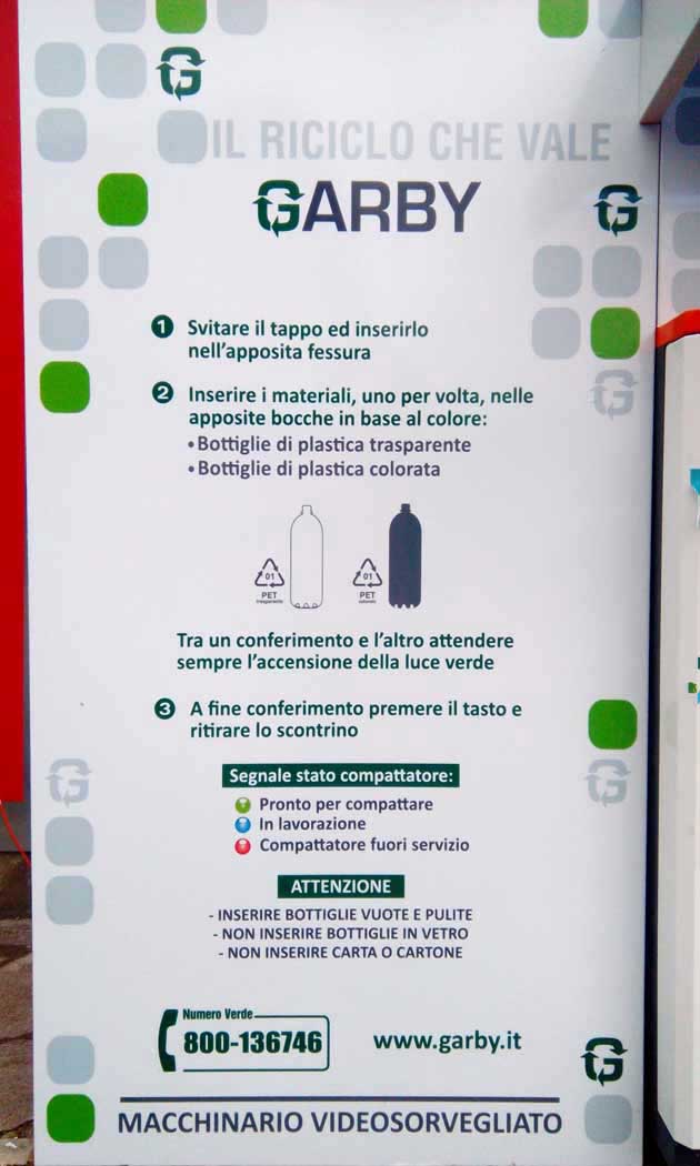 Si tratta di una macchina “mangiarifiuti” differenziati, un vero e proprio compattatore (di bottiglie in Pet) il quale, in cambio dello smaltimento differenziato, rilascia uno scontrino a punti, uno per ogni pezzo conferito, ed i punti accumulati valgono un buono sconto presso l’attività che ospita il macchinario.