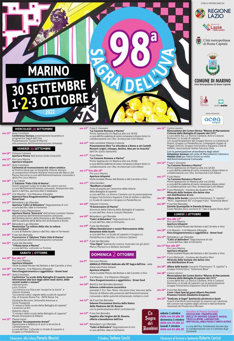 Molte le novità presentate in programma: in primis l’attenzione alla sicurezza; la Sagra dei Bambini che si svolgerà presso il giardino di Borgo Garibaldi; il Primo Palio della Città di Marino con i giochi popolari; le luminarie a risparmio energetico, create apposta per l’evento, che insieme ai grappoli d’uva rievocano la canzone Nannì che ci rappresenta in tutto il mondo; il ritorno dei fuochi d’artificio ma in versione ‘Spark’, un’illuminazione artistica a basso impatto acustico a tutela anche degli animali, e ancora molto altro con il ritorno alle tradizioni dettato anche dagli spettacoli culturali in programma che animeranno le vie del centro storico.