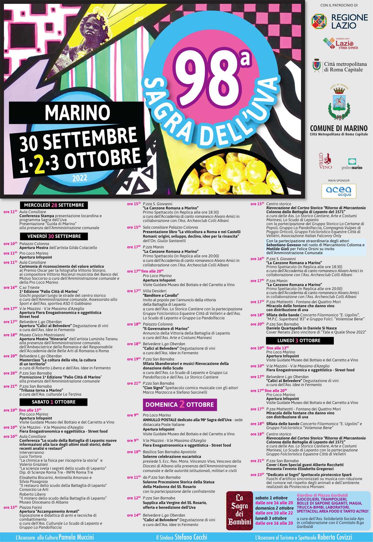 «Protagonista di questa 98^ edizione è la Città, una Marino vestita a festa, un tripudio di lucine che sottolinea la bellezza di ciascuno scorcio, le luminarie personalizzate per la nostra città da maestri artigiani, il terrazzo panoramico di Largo Oberdan, sfondo di un salotto, ‘Calici al Belvedere’ in collaborazione con l’Associazione Idee in Fermento, dedicato alla degustazione, e ancora street food di qualità e artisti di spicco.