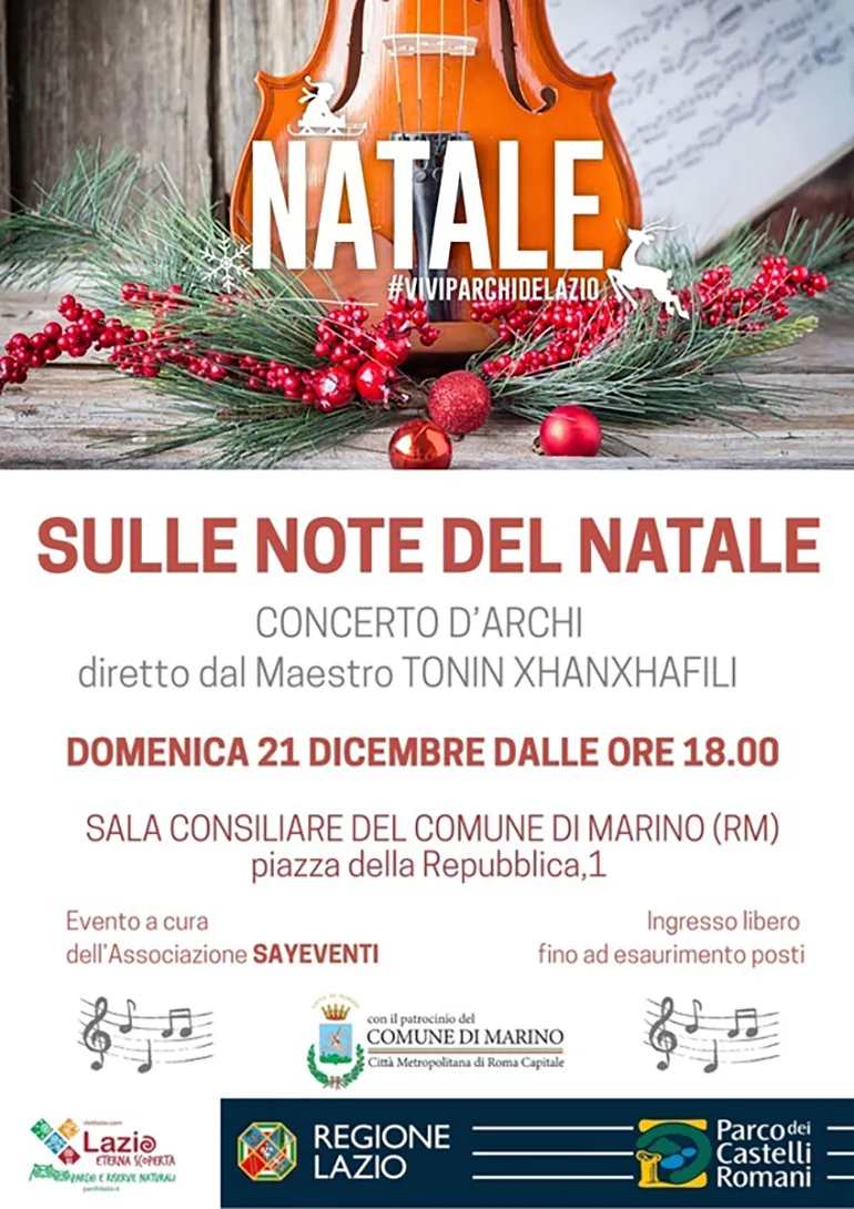 MARINO (Luciana Vinci) – Il Parco dei Castelli Romani è lieto di invitarvi al concerto d’archi “Sulle Note del Natale”, che si svolgerà Domenica 21 Dicembre alle ore 18, presso la Sala Consiliare del Comune di Marino.