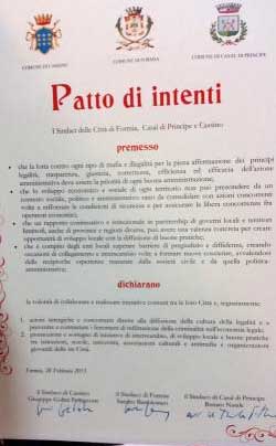 «Un Patto di Intenti sottoscritto insieme ai colleghi Sandro Bartolomeo, sindaco di Formia e Renato Natale, sindaco di Casal di Principe, per la realizzazione di iniziative comuni finalizzate a contrastare i fenomeni di infiltrazioni criminale nel tessuto economico e sociale dei tre territori che rappresentiamo».