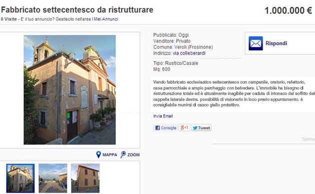 VEROLI (FR) – «Vendo fabbricato ecclesiastico settecentesco con campanile, oratorio, refettorio, casa parrocchiale e ampio parcheggio con belvedere. L’immobile ha bisogno di ristrutturazione totale ed è attualmente inagibile per caduta di intonaco dal soffitto della cappella laterale destra. Possibilità di visionarlo in loco previo appuntamento. E’ consigliabile munirsi di casco giallo protettivo».