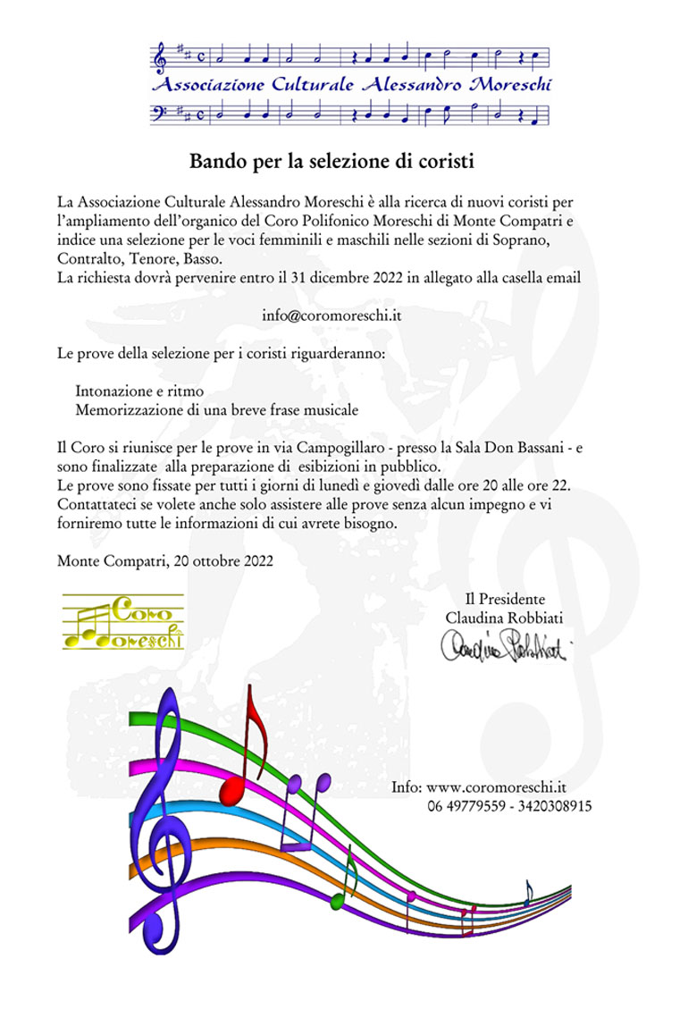 MONTE COMPATRI (Luciana Vinci) – Bando per la selezione di Coristi per l’Associazione Culturale Alessandro Moreschi: scadenza il 31 Dicembre 2022!