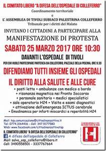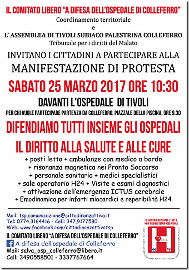 «Il Comitato libero “A Difesa dell’Ospedale di Colleferro” – Coordinamento territoriale Sabato 25 Marzo 2017 sarà a Tivoli, sotto l’ospedale San Giovanni, per manifestare e difendere gli ospedali e il diritto alla salute. La partecipazione è libera e pertanto possono intervenire Rappresentanti istituzionali, Comitati, Associazioni e Cittadini.