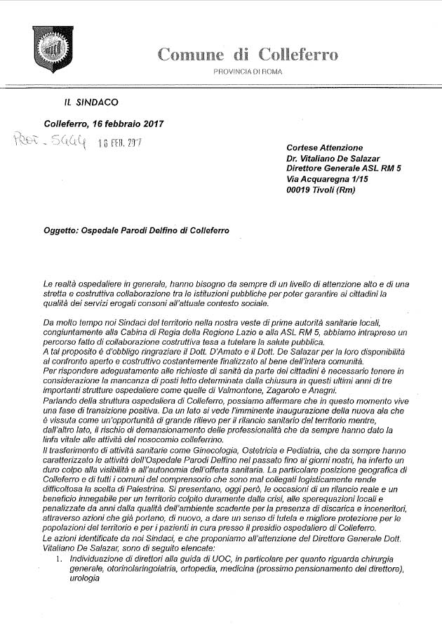 COLLEFERRO (RM) – Nella mattinata di oggi, 16 Febbraio, il Sindaco di Colleferro Pierluigi Sanna ha inviato una circostanziata lettera al Direttore Generale Vitaliano De Salazar a proposito dell’Ospedale “L.P. Delfino” di Colleferro. La lettera è stata sottoscritta anche dagli altri Sindaci del Distretto Sanitario Rm G/6.