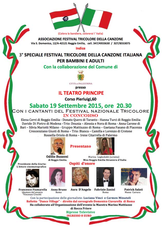 PALESTRINA (RM) – Con la collaborazione del Comune di Palestrina, Sabato 19 Settembre 2015, alle ore 20.30, presso il Teatro Principe, si terrà il “3° Speciale Festival Tricolore della Canzone Italiana per Bambini ed Adulti”, cui parteciperanno i Cantanti del Festival Nazionale Tricolore in Concorso.
