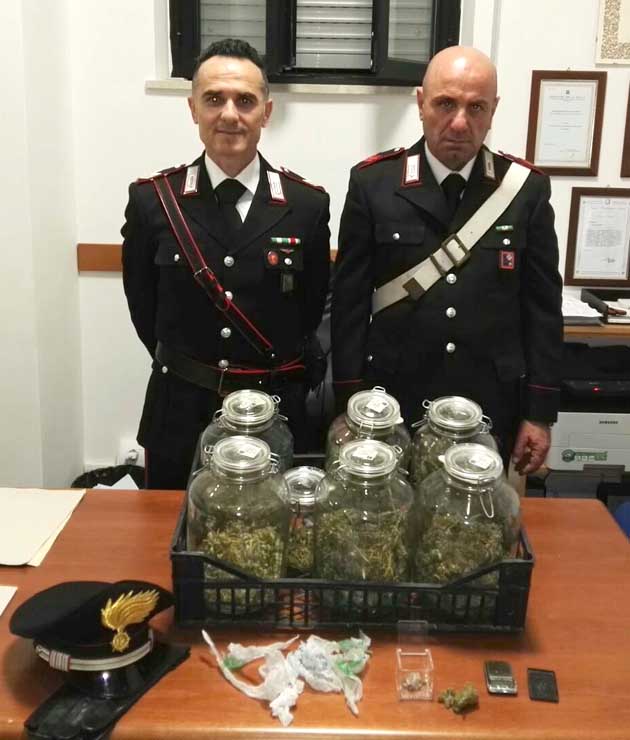 I militari operanti, nel corso della perquisizione, rinvenivano all’interno dell’abitazione del predetto sei barattoli in vetro da cinque litri contenenti infiorescenze di marijuana per complessivi grammi 800, un bilancino di precisione e materiale vario atto al confezionamento.