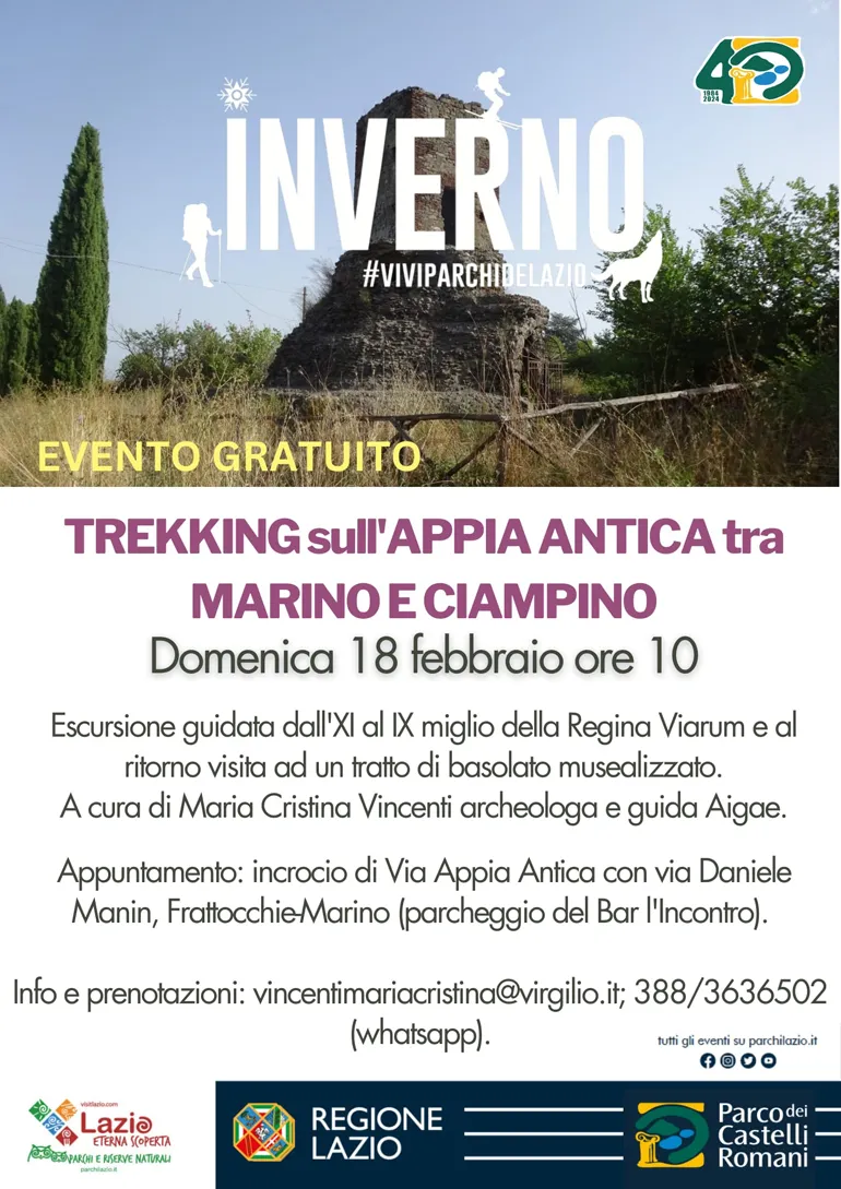 Domenica 18 Febbraio, appuntamento alle ore 10:00, all’incrocio di Via Appia Antica con Via Daniele Manin, Frattocchie-Marino (parcheggio del Bar l’Incontro), per l’escursione guidata gratuita: “Trekking sull’Appia Antica tra Marino e Ciampino”.