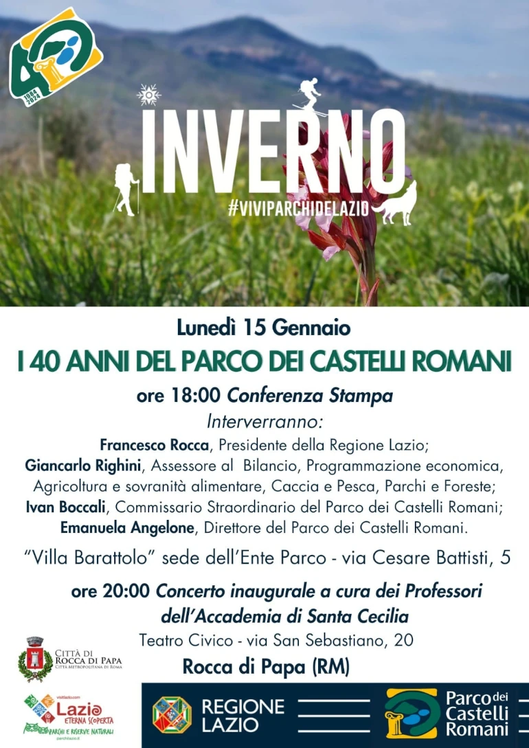 PARCO REGIONALE DEI CASTELLI ROMANI (Luciana Vinci) – Lunedì 15 Gennaio alle ore 18 a Villa Barattolo (Via Cesare Battisti 5, Rocca di Papa) si svolgerà la conferenza stampa di presentazione delle attività in programma per i quarant’anni del Parco regionale dei Castelli Romani.