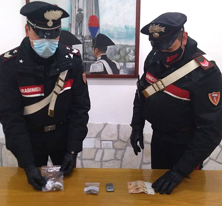Subito fermati e sottoposti a controllo, i Carabinieri hanno accertato che uno dei due aveva appena acquistato due involucri di marijuana, per 13 grammi complessivi, pagandola 100 euro.
