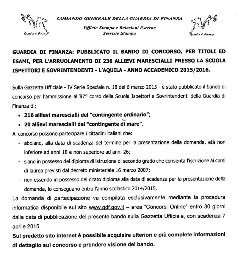 Pubblicato il Bando di Concorso per 236 Allievi Marescialli della Guardia di Finanza Anno Accademico 2015/2016 19 Marzo 2015 Redazione Allievi Marescialli, Bando di Concorso, Cronaca, Guardia di Finanza, Lavoro, Occupazione, Roma, Roma ROMA – È stato pubblicato dalla Guardia di Finanza, il 12 Marzo scorso, il Bando di concorso, per titoli ed esami, per l’arruolamento di 236 allievi Marescialli presso la Scuola Ispettori e Sovrintendenti de L’Aquila per l’Anno Accademico 2015/2016. (click per ingrandire)
