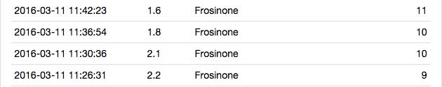 La prima – di magnitudo 2.2 gradi a 10 Km di profondità – è stata registrata dai sismografi della Sala Sismica Ingv-Roma, alle ore 12:26 (+1h rispetto hUTC), la seconda alle 12:30 (stessa profondità, magnitudo 2.1), la terza alle 12:36 pari a 1.8 e la quarta alle 12:42 di magnitudo 1.6.