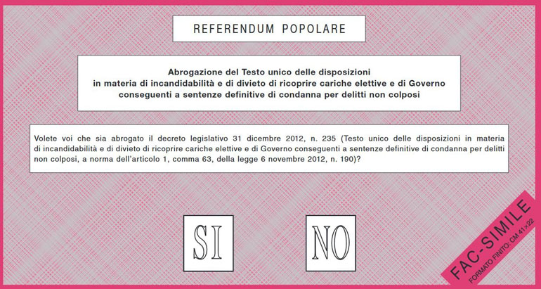 Referendum n. 1 – Abrogazione del Testo unico delle disposizioni in materia di incandidabilità e di divieto di ricoprire cariche elettive e di Governo conseguenti a sentenze definitive di condanna per delitti non colposi.