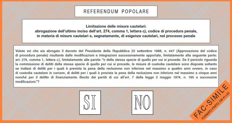 Referendum n. 2 – Limitazione delle misure cautelari: abrogazione dell’ultimo inciso dell’art. 274, comma 1, lettera c), codice di procedura penale, in materia di misure cautelari e, segnatamente, di esigenze cautelari, nel processo penale.