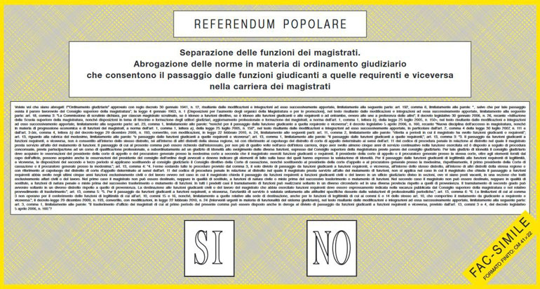 Volete voi che siano abrogati: l’“Ordinamento giudiziario” approvato con regio decreto 30 gennaio 1941, n. 12, risultante dalle modificazioni e integrazioni ad esso successivamente apportate, limitatamente alla seguente parte: art. 192, comma 6, limitatamente alle parole: “, salvo che per tale passaggio esista il parere favorevole del Consiglio superiore della magistratura”; la legge 4 gennaio 1963, n. 1 (Disposizioni per l’aumento degli organici della Magistratura e per le promozioni), nel testo risultante dalle modificazioni e integrazioni ad essa successivamente apportate, limitatamente alla seguente parte: art. 18, comma 3: “La Commissione di scrutinio dichiara, per ciascun magistrato scrutinato, se è idoneo a funzioni direttive, se è idoneo alle funzioni giudicanti o alle requirenti o ad entrambe, ovvero alle une a preferenza delle altre”; il decreto legislativo 30 gennaio 2006, n. 26, recante «Istituzione della Scuola superiore della magistratura, nonché disposizioni in tema di tirocinio e formazione degli uditori giudiziari, aggiornamento professionale e formazione dei magistrati, a norma dell’art. 1, comma 1, lettera b), della legge 25 luglio 2005, n. 150», nel testo risultante dalle modificazioni e integrazioni ad esso successivamente apportate, limitatamente alla seguente parte: art. 23, comma 1, limitatamente alle parole: “nonché per il passaggio dalla funzione giudicante a quella requirente e viceversa”; il decreto legislativo 5 aprile 2006, n. 160, recante “Nuova disciplina dell’accesso in magistratura, nonché in materia di progressione economica e di funzioni dei magistrati, a norma dell’art. 1, comma 1, lettera a), della legge 25 luglio 2005, n. 150”, nel testo risultante dalle modificazioni e integrazioni ad esso successivamente apportate, in particolare dall’art. 2, comma 4 della legge 30 luglio 2007, n. 111 e dall’art. 3-bis, comma 4, lettera b) del decreto-legge 29 dicembre 2009, n. 193, convertito, con modificazioni, in legge 22 febbraio 2010, n. 24, limitatamente alle seguenti parti: art. 11, comma 2, limitatamente alle parole: “riferita a periodi in cui il magistrato ha svolto funzioni giudicanti o requirenti”; art. 13, riguardo alla rubrica del medesimo, limitatamente alle parole: “e passaggio dalle funzioni giudicanti a quelle requirenti e viceversa”; art. 13, comma 1, limitatamente alle parole: “il passaggio dalle funzioni giudicanti a quelle requirenti,”; art. 13, comma 3: “3. Il passaggio da funzioni giudicanti a funzioni requirenti, e viceversa, non è consentito all’interno dello stesso distretto, né all’interno di altri distretti della stessa regione, né con riferimento al capoluogo del distretto di corte di appello determinato ai sensi dell’art. 11 del codice di procedura penale in relazione al distretto nel quale il magistrato presta servizio all’atto del mutamento di funzioni. Il passaggio di cui al presente comma può essere richiesto dall’interessato, per non più di quattro volte nell’arco dell’intera carriera, dopo aver svolto almeno cinque anni di servizio continuativo nella funzione esercitata ed è disposto a seguito di procedura concorsuale, previa partecipazione ad un corso di qualificazione professionale, e subordinatamente ad un giudizio di idoneità allo svolgimento delle diverse funzioni, espresso dal Consiglio superiore della magistratura previo parere del consiglio giudiziario. Per tale giudizio di idoneità il consiglio giudiziario deve acquisire le osservazioni del presidente della corte di appello o del procuratore generale presso la medesima corte a seconda che il magistrato eserciti funzioni giudicanti o requirenti. Il presidente della corte di appello o il procuratore generale presso la stessa corte, oltre agli elementi forniti dal capo dell’ufficio, possono acquisire anche le osservazioni del presidente del consiglio dell’ordine degli avvocati e devono indicare gli elementi di fatto sulla base dei quali hanno espresso la valutazione di idoneità. Per il passaggio dalle funzioni giudicanti di legittimità alle funzioni requirenti di legittimità, e viceversa, le disposizioni del secondo e terzo periodo si applicano sostituendo al consiglio giudiziario il Consiglio direttivo della Corte di cassazione, nonché sostituendo al presidente della corte d’appello e al procuratore generale presso la medesima, rispettivamente, il primo presidente della Corte di cassazione e il procuratore generale presso la medesima.”; art. 13, comma 4: “4. Ferme restando tutte le procedure previste dal comma 3, il solo divieto di passaggio da funzioni giudicanti a funzioni requirenti, e viceversa, all’interno dello stesso distretto, all’interno di altri distretti della stessa regione e con riferimento al capoluogo del distretto di corte d’appello determinato ai sensi dell’art. 11 del codice di procedura penale in relazione al distretto nel quale il magistrato presta servizio all’atto del mutamento di funzioni, non si applica nel caso in cui il magistrato che chiede il passaggio a funzioni requirenti abbia svolto negli ultimi cinque anni funzioni esclusivamente civili o del lavoro ovvero nel caso in cui il magistrato chieda il passaggio da funzioni requirenti a funzioni giudicanti civili o del lavoro in un ufficio giudiziario diviso in sezioni, ove vi siano posti vacanti, in una sezione che tratti esclusivamente affari civili o del lavoro. Nel primo caso il magistrato non può essere destinato, neppure in qualità di sostituto, a funzioni di natura civile o miste prima del successivo trasferimento o mutamento di funzioni. Nel secondo caso il magistrato non può essere destinato, neppure in qualità di sostituto, a funzioni di natura penale o miste prima del successivo trasferimento o mutamento di funzioni. In tutti i predetti casi il tramutamento di funzioni può realizzarsi soltanto in un diverso circondario ed in una diversa provincia rispetto a quelli di provenienza. I